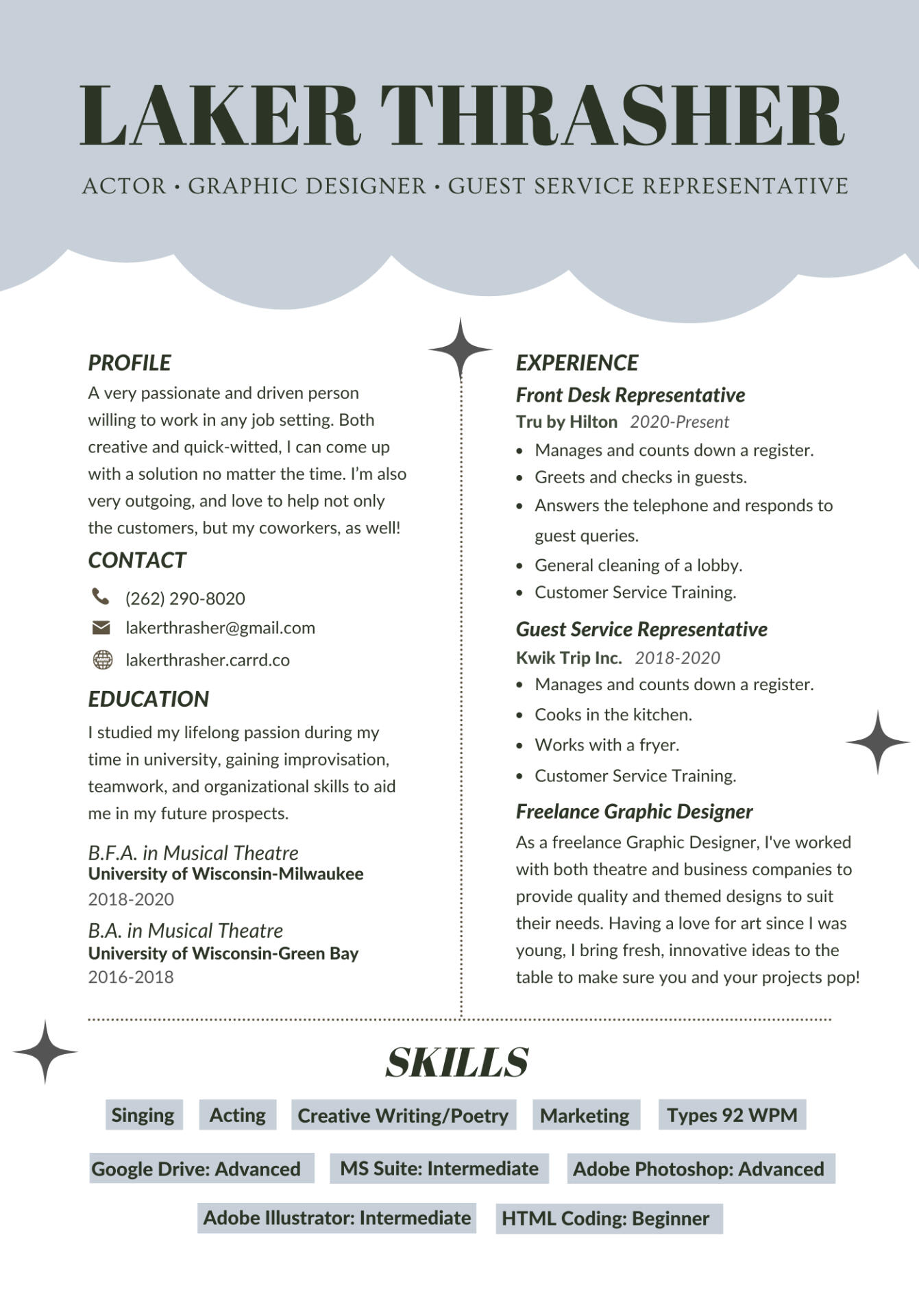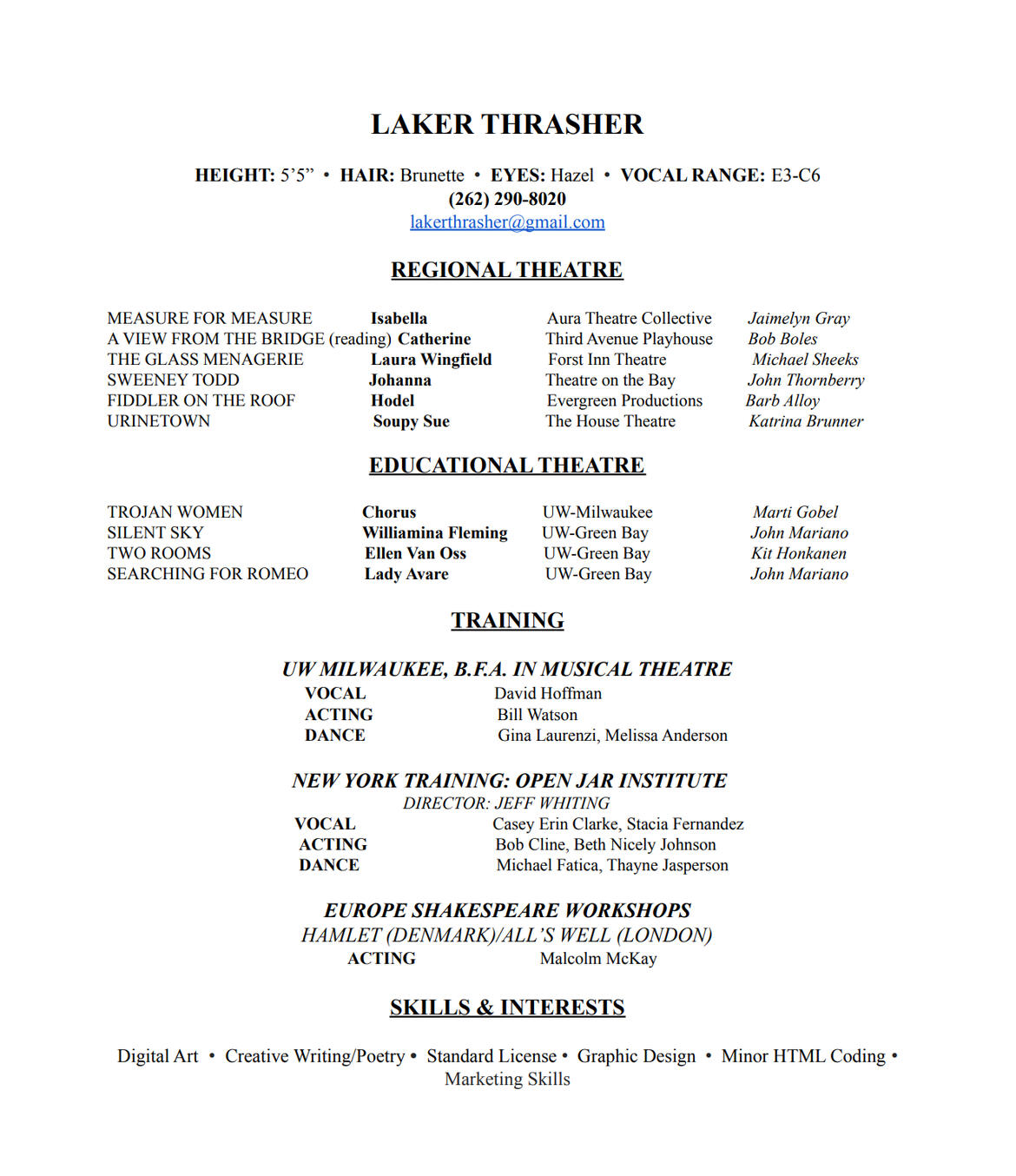hi! i'm laker thrasher, my pronouns are they/them, and thanks for finding your way here! i'm an actor based out of southern wisconsin who has experience in musical theatre, shakespeare, and other contemporary and classical works. off the stage, i'm a self-taught freelance graphic designer with a passion for advertisements based in company-wide and personal advancements.